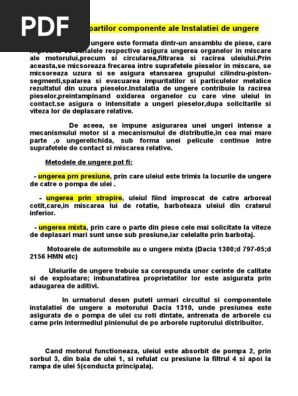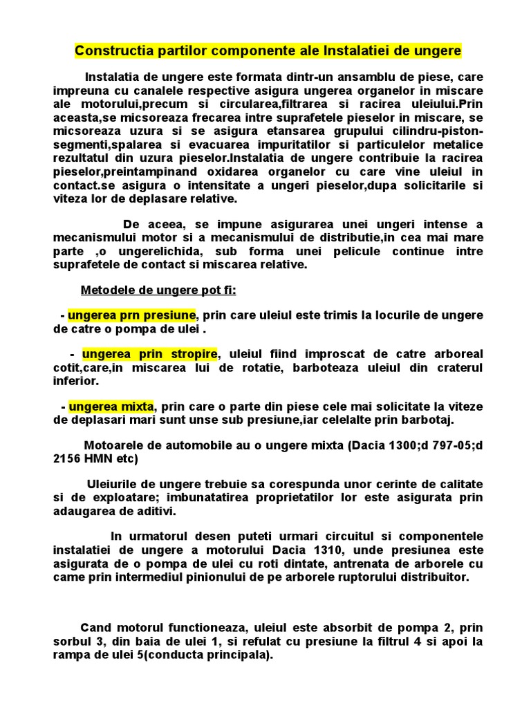 Repararea sistemului de ungere 16 cap 5. Ainstalatia de ungere a unui autoturism are rolul de a asigura o lubrifiere optima intre partile motorului unde exista frecare sa filtreze si eventual sa raceasca uleiul nivelul optim al uleiului este marcat de producatorul autovehicului pe joja si reprezinta cantitatea necesara de ulei pentru a maximiza durata de viata a motorului. Memoriu justificativ 4 cap 2. Norme specifice de securitate a muncii pentru intretinerea si repararea autovehiculelor 18 bibliografie 20.