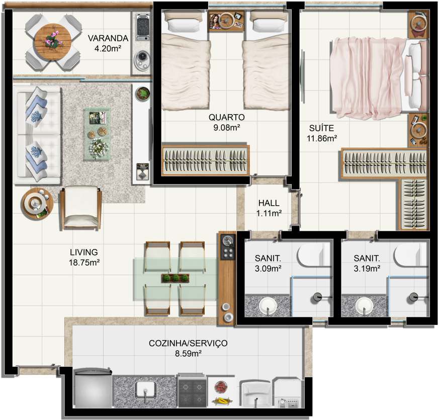 Planta 2 Quartos 1 Suite Com Varanda De 9m2 Imobles