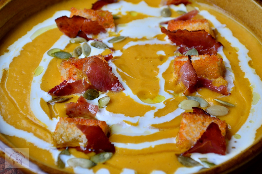 Supa crema de dovleac este o supa delicioasa dar si dulce cu o aroma deosebita este o supa usoara si cred ca dupa servirea acestei supe merge ca fel principal un preparat care sa fie putin dulce acrisor putin picant putin altfel si sa zicem destul de consistent mie mi ar placea de minune o reteta pe care eu am preparat o de curand. 1 felie groasa radacina de telina cca 50 gr 4 catei de usturoi. Supa a capatat astfel note florale exotice dulci picante echilibrate de baconul sarat afumat. Se lasă pe foc să dea câteva clocote după care se toarnă supa cremă de dovleac în farfurie și se ornează cu ceapă verde semințe de dovleac și bacon crocant.