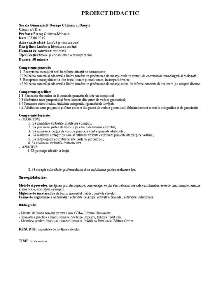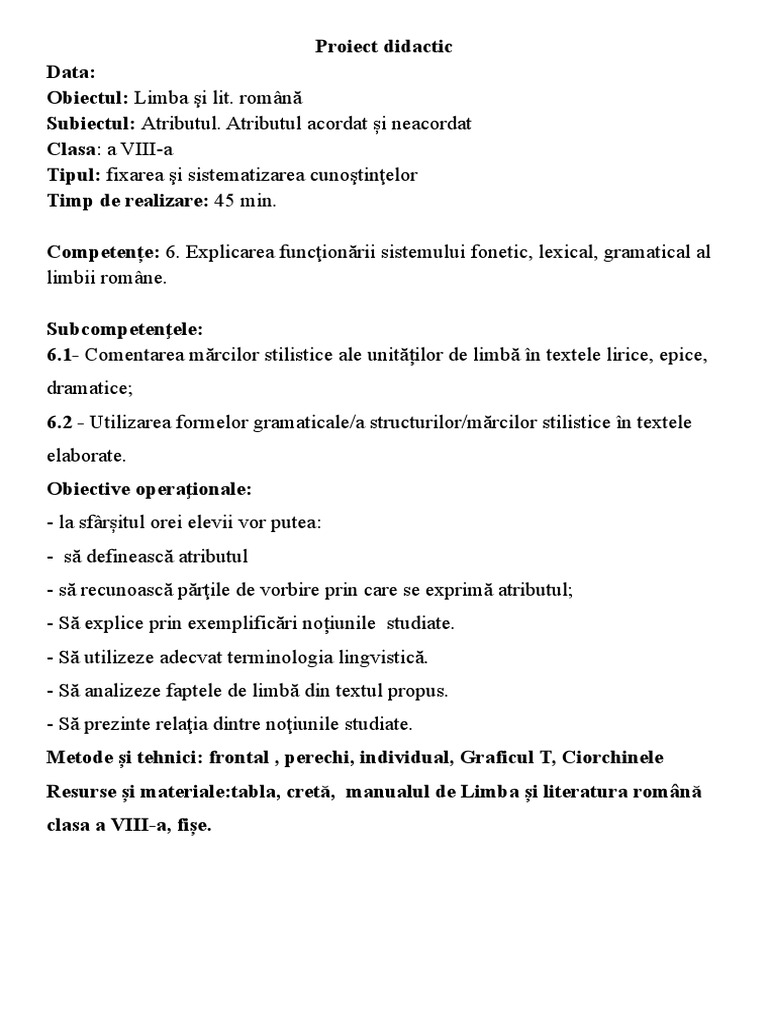 Proiect De Lecție Atributul Acordat și Neacordat